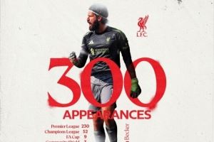 据利物浦官方统计,这是阿利森代表利物浦出战的第300场比赛。