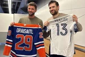 穆勒与德国冰球选手德赖塞特尔交换球衣并合影,后者效力于NHL埃德蒙顿油人队,也是司职前锋,两人社媒转发合照,并互称对方为传奇。