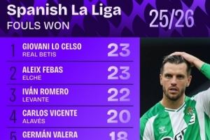 体育资讯10月7日讯 日前,Squawka统计了本赛季西甲被犯规次数排行,洛塞尔索23次居首,朱利亚诺-西蒙尼18次并列第五。
